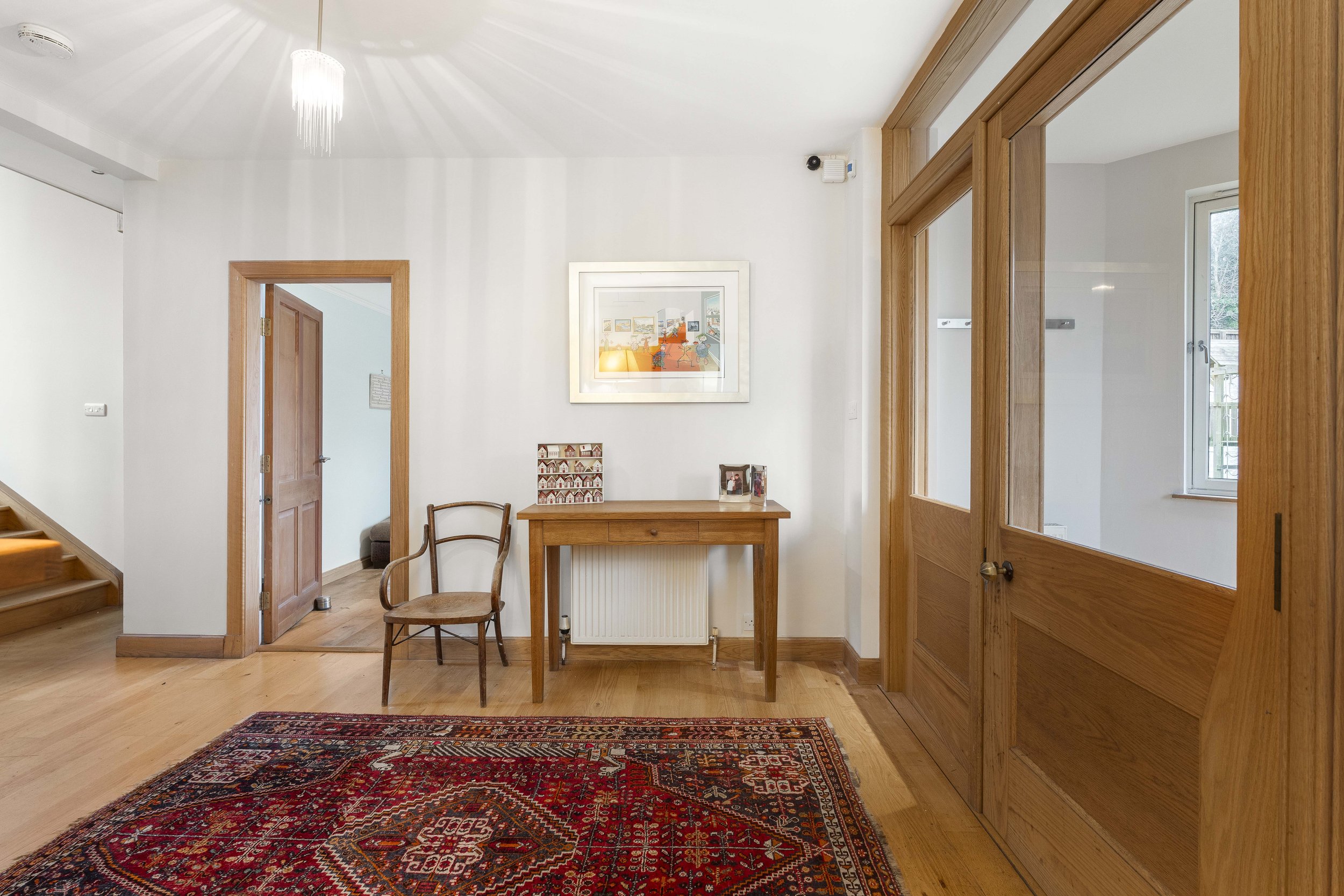 A spacious family room enjoys triple aspects with Velux skylights and double patio doors providing direct access to the raised decking. Two double bedrooms are located on this level, one of which is currently utilised as a home gym. A fully tiled four-piece family bathroom, with a corner shower cubicle, completes the accommodation on this floor.